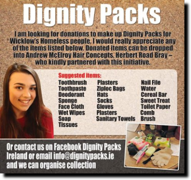 Molly and her volunteers are creating Dignity Pack Rucksacks for homeless men and women and distributing them across a number of towns in Co Wicklow.